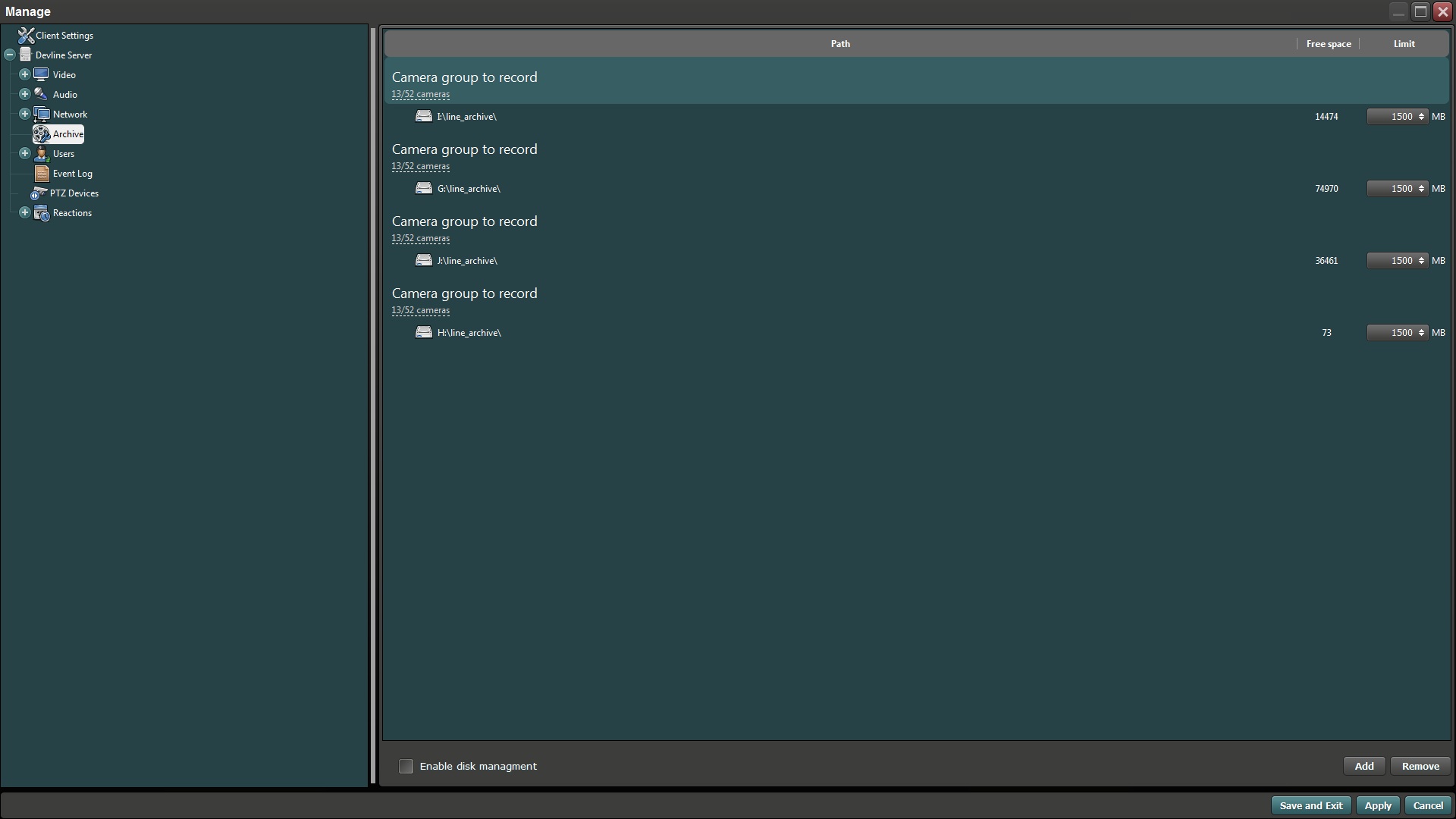 The same camera and source of the recording can not be assigned to different groups. The program has the cyclic video recording mode: if the disk space is over the program will start to write new data over the old one. If several folders for archives were assigned for a group, they will be filled sequentially.